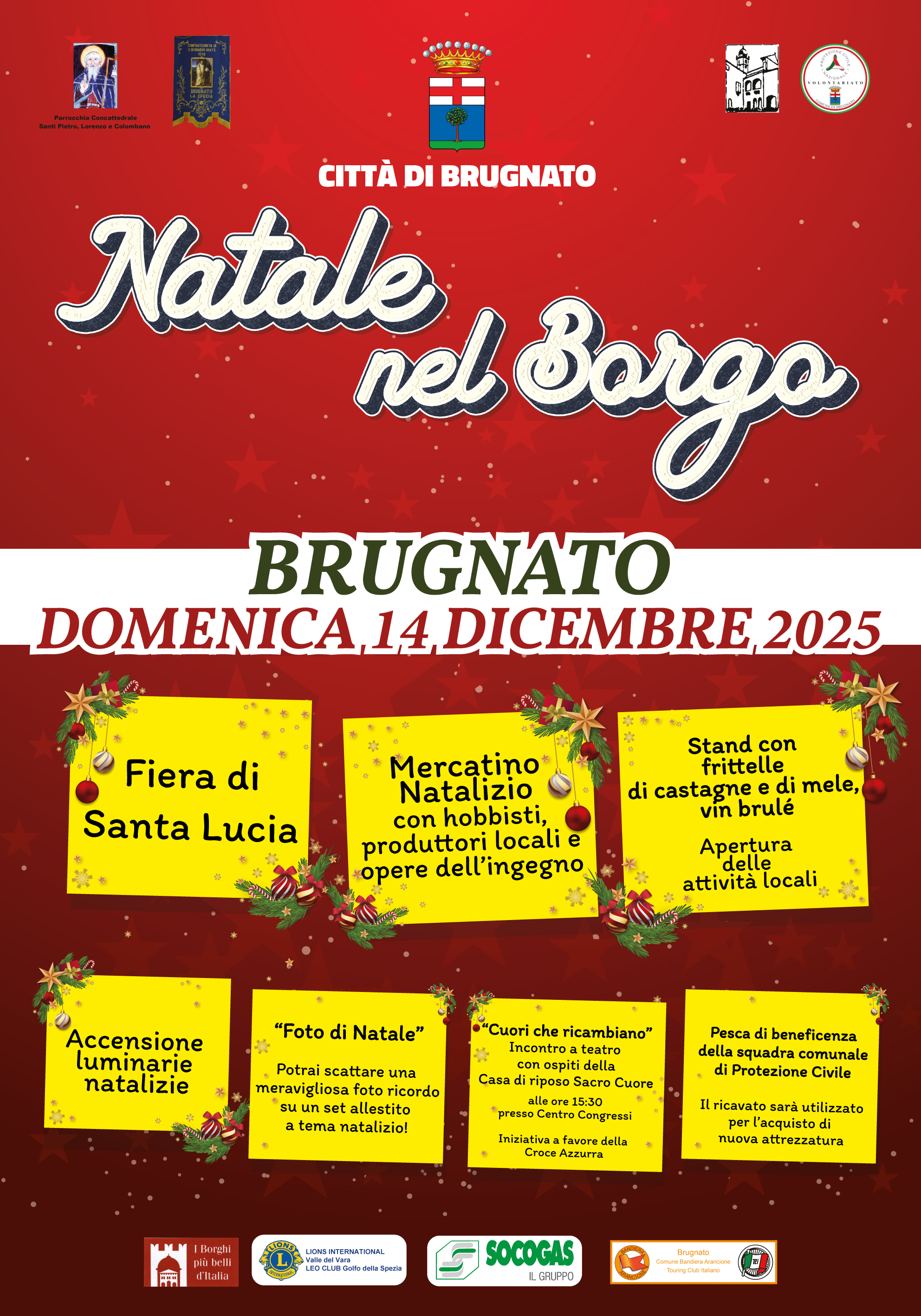 Mercatino natalizio, stand con frittelle e vin brulè, apertura attività locali, accensione luminarie natalizie, foto di natale, pesca di beneficenza della squadra comunale di protezione civile, incontro a teatro con ospiti della casa di riposo Sacro Cuore alle ore 15,30 presso il centro congressi.
