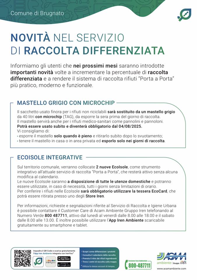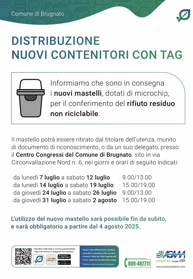 Il nuovo mastello, che servirà anche per conferire i presidi medico-sanitari (pannolini e pannoloni), potrà essere ritirato presso il Centro Congressi del Comune di Brugnato, sito in via Circonvallazione Nord nr. 6, nei giorni e orari indicati nell’allegato prospetto, potrà essere utilizzato fin da subito e sarà obbligatorio a partire da lunedì 04/08/2025.